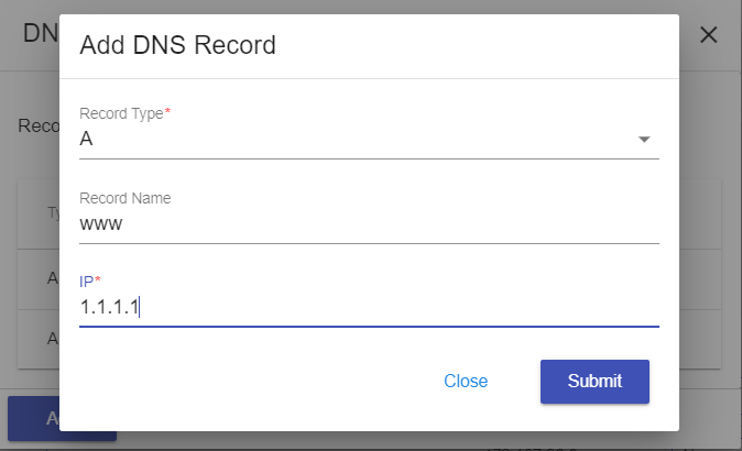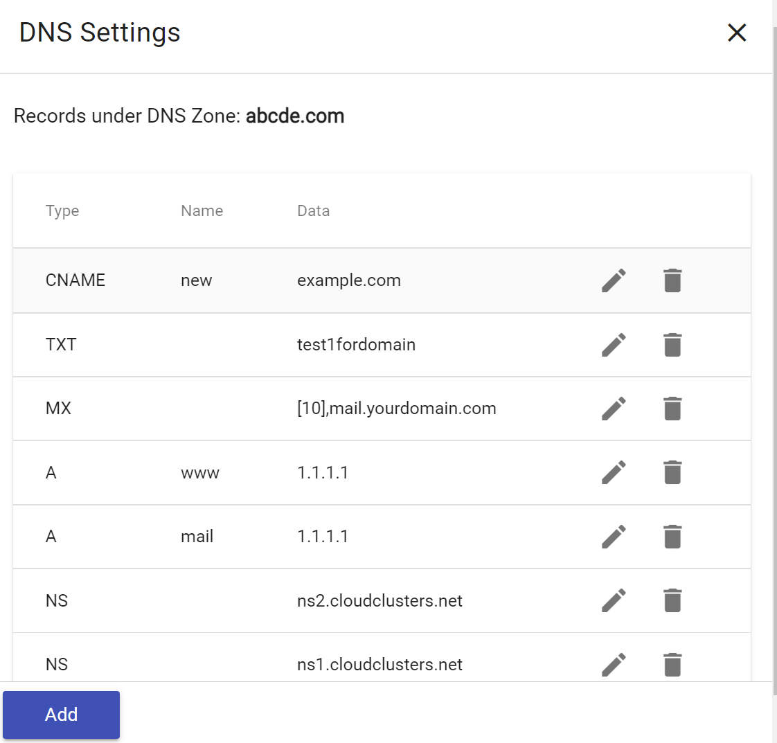 Click Add to add DNS records. We support five DNS record types, including A record, MX record, NX record, TXT record, and CNAME record.