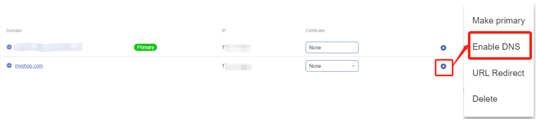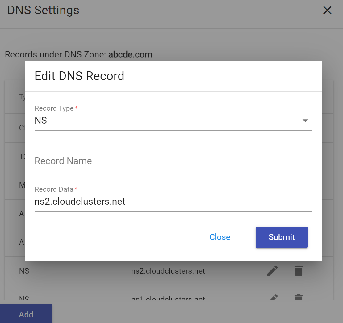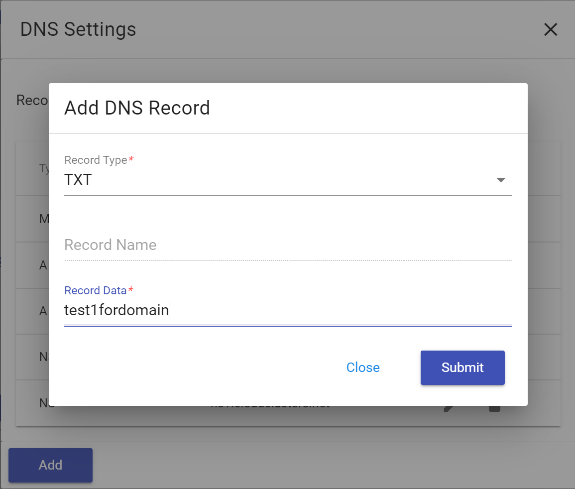 Click the icon at the end of the domain you just added, followed by clicking "Manage DNS". The DNS Settings dialog box will appear.