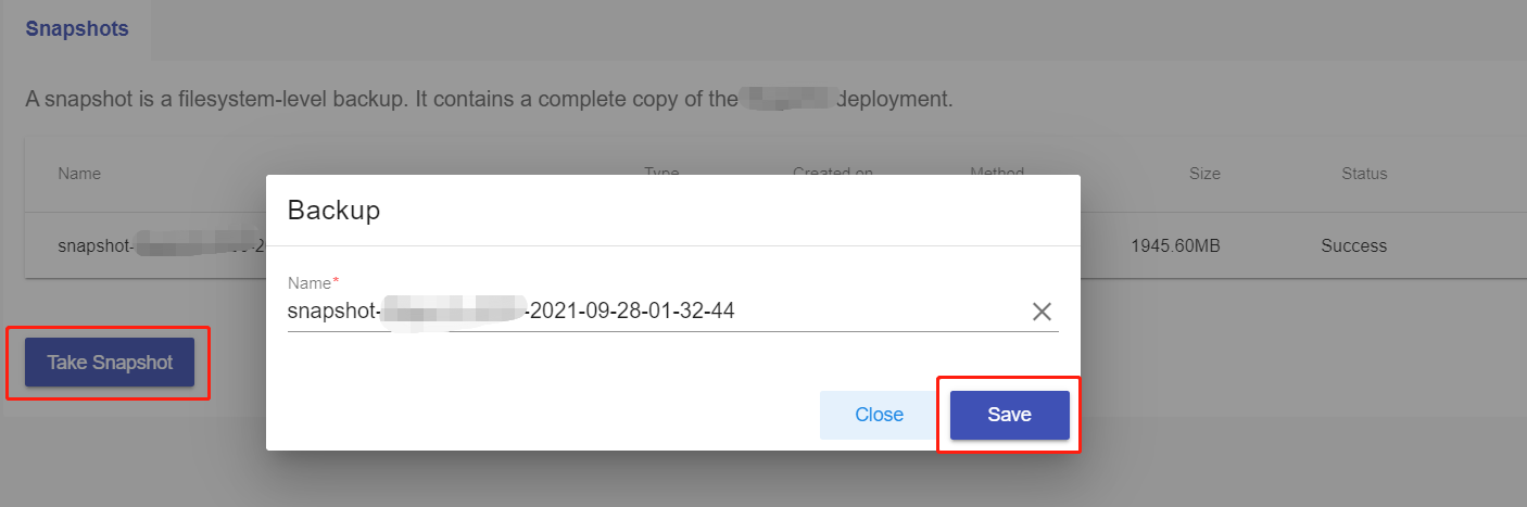 Click "TAKE SNAPSHOT". A confirmation box will pop up. You are free to rename the backup. Click on "SAVE" to start the backup process. You can get your backup in seconds after that.